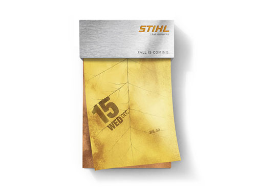 The agency created an invention. Introducing the autumn calednar 2010 - the first tear-off calendar, that tears off its leaves automatically. To show the necessity of Stihl leaf blowers in an entertaining way - day by day.
