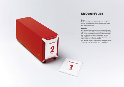 They captured one magical moment of the McDonald's experience - the build-up of anticipation for the food that occurs when taking a napkin just before eating - and transported this feeling to business partners' offices 365 times a year by using a napking dispenser which serves as a tear-off calendar.