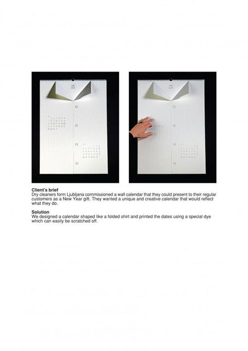 Pivk Calendar Dry cleaners from Ljubljana commissioned a wall calendar that they could present to their regular customers as a new year gift. They wanted a unique and creative calendar that would reflect what they do. Company: Futura DDB, SLOVENIA, Ljubljana