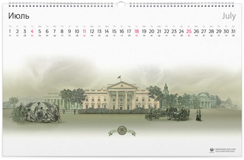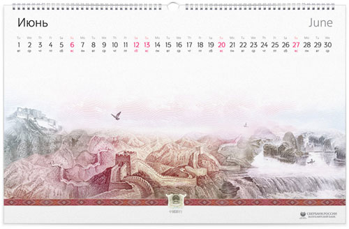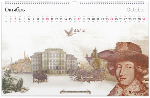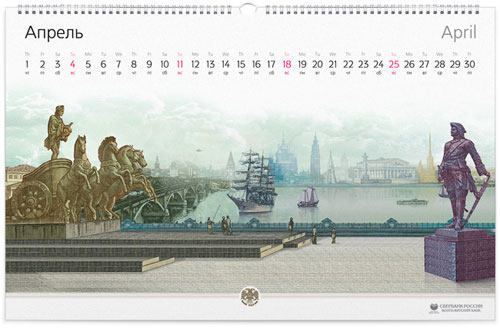 Sberbank 2010 Calendar The Calendar of Sberbank for 2010 was designed with the intention of keeping each month unique and nice to look at. A bank calendar centered around money. Original, isn’t it? We took 12 currencies and made graphic stories based on elements from different notes. The idea was simple to visualize but hard to realize. It took about 2 months to make unfriendly elements become best friends.