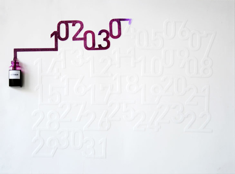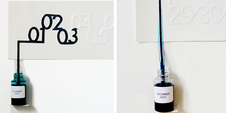 Ink Calendar The "Ink Calendar" makes use of the timed pace of the ink spreading onto the paper to indicate time. The ink is absorbed slowly, and the numbers in the calendar are "printed" daily. One a day, they are filled with ink until the end of the month. It is a self-updating calendar which enhances the perception of time passing. The ink colors are based on a spectrum which relate to a “color temperature scale”, each month having a color related to our perception of its respective season. The colors range from dark blue in December, to three shades of green in Spring and orange or red in the summer. The scale for measuring the “color temperature” that I have used is a standard called ‘D65’ and corresponds roughly to a midday sun in Western / Northern Europe. Designer : Oscar Diaz+ website Size : Client : Prototype Production Method : |