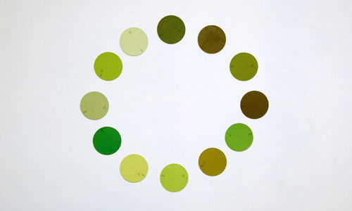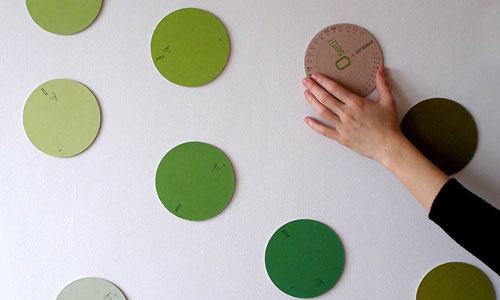 There are 12 circles in 12 variations of green color for 12 months. Every circle has a two sides - one with calendar of the certain month and other in green color with a "message". There are magnets in the center of every cardboard circle and there are 12 self-stick plates aside, which could be positioned on any wall, glass, furniture surface... The user can flip the calendar side of the month which he/she wants to look at and enjoy in the beauty of the rest green circles...