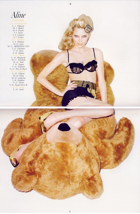 Vogue Calendar The 2009 Vogue Paris calendar — which comes as a supplement to the December/January issue — arrived a little early. Fourteen different girls are featured, photographed by Terry Richardson and styled by Carine Roitfeld as pinups in Louis Vuitton lingerie and shoes. Jourdan Dunn is a sexy nurse, Ali Michael a sexy cheerleader, Eniko Mihalik graces the cover as sexy kitten — Carine even included a spread for the solar months, with patrons saints Alber (Elbaz), Gareth (Pugh), Lara (Stone), and their ilk celebrated. Designer : DiorettePhotographer : Terry Richardson + website Client : Vogue Paris Magazine Production Method : |