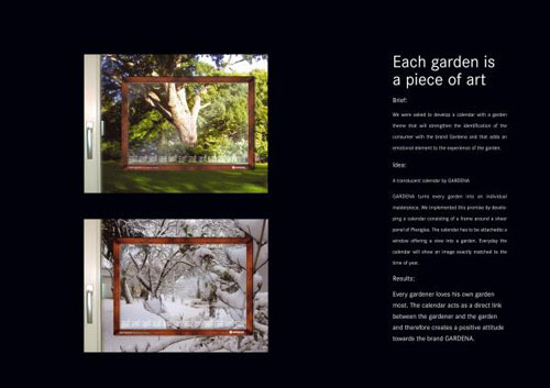 Company: Serviceplan Dritte Werbeagentur, GERMANY, Munich Creative Director: WINFRIED BERGMANN Creative Director: Christoph Everke Text/ Copywriter: Tim Strathus Art Director: Matthias Mittermüller Account Executives: Daniela Klüglein Account Executives: Christiane Löschke Graphic Design: Andrea Gärtner Company: GARDENA Deutschland, GERMANY, Munich Advertiser`s Supervisor: Werner Zingler