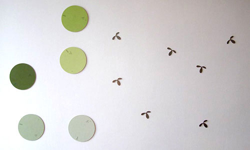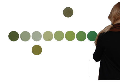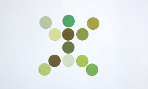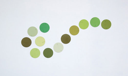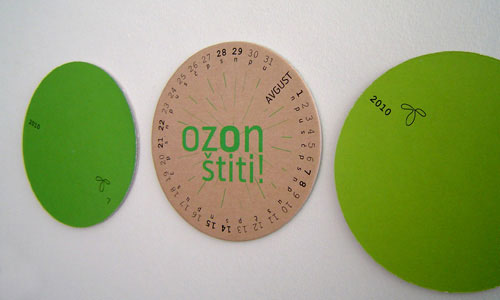 There are 12 circles in 12 variations of green color for 12 months. Every circle has a two sides - one with calendar of the certain month and other in green color with a "message". There are magnets in the center of every cardboard circle and there are 12 self-stick plates aside, which could be positioned on any wall, glass, furniture surface... The user can flip the calendar side of the month which he/she wants to look at and enjoy in the beauty of the rest green circles...
