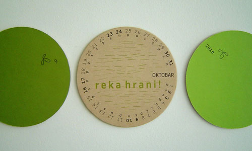 This design solution provide flexibility in using calendar as a kind of unique and special product... Making symbols or signs from 12 circles, everybody create his/her own vision of the next year... Everybody has a freedom to play and create his/her own time... The message on every of 12 green circles / 12 months, reminds on the phenomenas from the nature and inspires to act positive regarding the natural environment...
