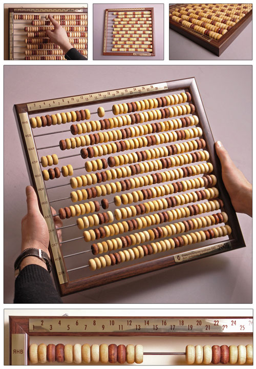 Abacus Calendar The quantity of spokes and counting beads on them is increased 12 and 356 pieces accordingly against to ordinary abacus. The idea is simple, which is not say about the production. |