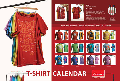 Leader T-Shirt Calendar Leader is a fashion store, and from this concept the idea of transforming the calendar into fashion came to light, so that people could wear it. Bringint the concept "with leader you are well dressed the entire year". |