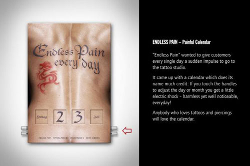 Painful Calendar "Endless Pain" wanted to give customers every single day a sudden impulse to go to the tattoo studio. Company: Weigertpirouzwolf, GERMANY, Hamburg